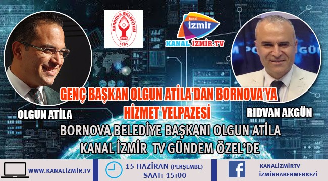 Rıdvan Akgün'ün hazırlayıp sunduğu Kanal İzmir Tv Gündem Özel programının 15 Haziran (Perşembe) günü saat 15.00'de canlı yayın konuğu Bornova Belediye Başkanı Olgun Atilla olacak. Atila, bugüne kadar yapmış olduğu ve bundan sonra yapacağı önemli projerle ilgili önemli açıklamalarda bulunacak.