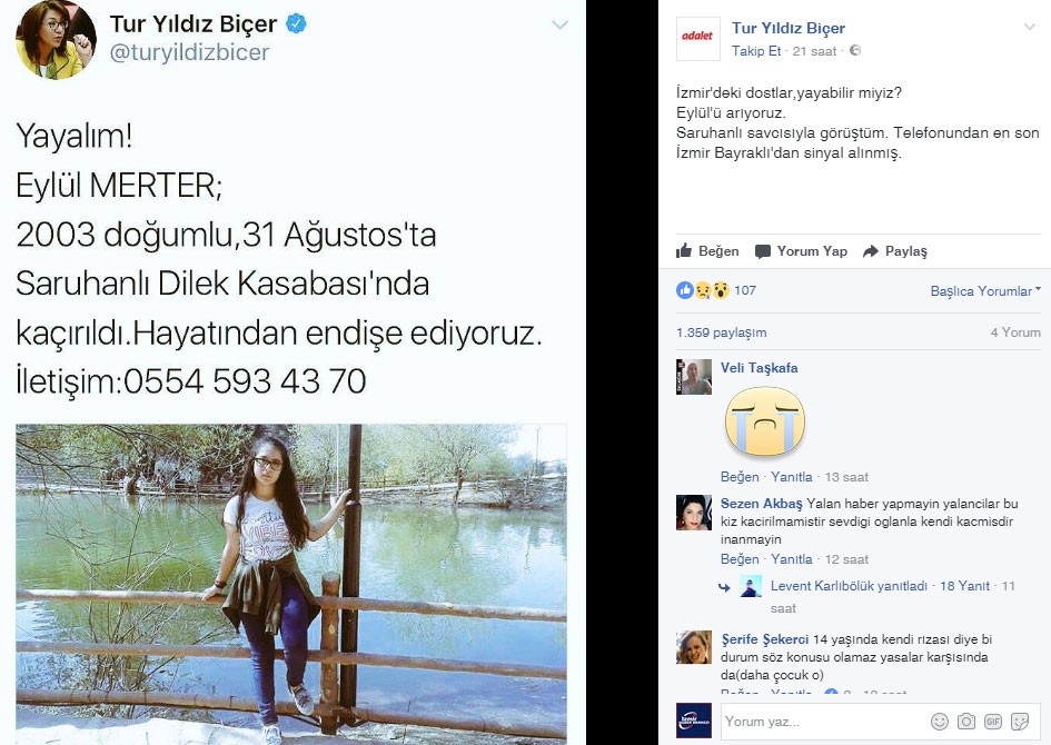 Manisa Saruhanlı'da yaşan olayda 31 Ağustos gecesi kaybolan 15 yaşındaki Eylül Merter henüz bulunamadı. Kimliği belirsiz kişilerce kaçırıldığı iddia edilen Merter'in babası Selman Merter, 4 gündür kızını aradıklarını ancak bir sonuca varamadıklarını ifade etti. Sosyal medyada bir şebeke tarafından kandırılıp, kaçırıldığı iddia edilen Eylül Merter'in bu durumunu CHP Manisa Milletvekili Tur Yıldız Biçer sosyal medya hesabından paylaşarak duyurdu.