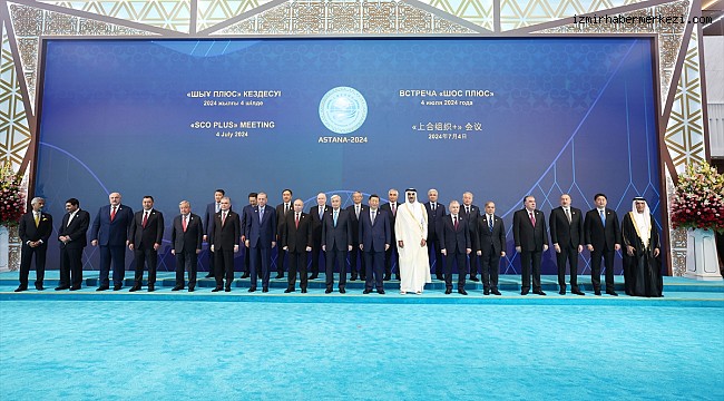 Kazakistan Cumhurbaşkanı Kasım Cömert Tokayev'in ev sahipliğinde "ŞİÖ +" formatında Bağımsızlık Sarayı'nda düzenlenen zirve öncesinde liderler, aile fotoğrafı için bir araya geldi.