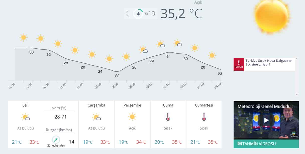 Meteoroloji Genel Müdürlüğü'nün 7 Eylül'de yaptığı duyuruya göre, hava sıcaklıkları gün geçtikçe artıyor. Sıcaklıkların mevsim normallerinin 3-5 derece üzerine çıktığı belirtildi. Haftanın ilk günü hava sıcaklığı 35 dereceyi bulurken, hafta sonuna doğru sıcak hava dalgası yurdu terk edecek. Hafta boyunca İzmir'de hava Eylül ayı ortalamaları civarında gidecek.