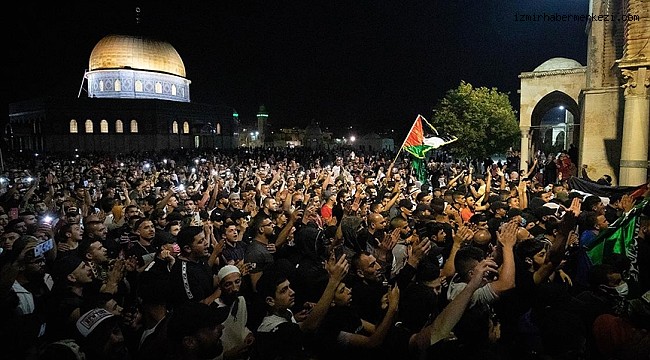 "Canımız kanımız feda olsun sana ey Aksa" ve "Hepimiz Şeyh Cerrah'ız" (İsrail'n bazı Filistinlileri evlerinden çıkarmak istediği Doğu Kudüs mahallesinin adı) şeklinde sloganlar atan yüzlerce kişi, daha sonra Aksa'nın Aslanlı Kapı ve Hutta Kapısı'na doğru yürüyüşe geçti.