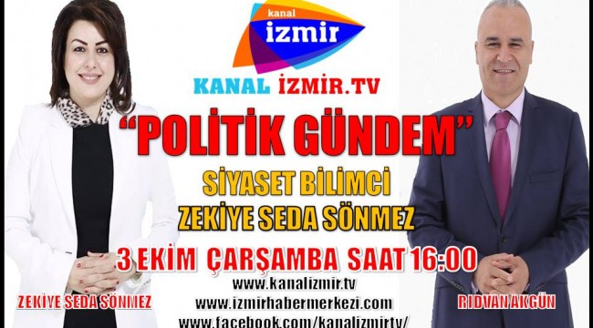 Kanal İzmir TV Politik Gündem programında her Çarşamba günü saat 16:00'da, haftanın öne çıkan siyasi ve ekonomik gelişmeleri Siyaset Bilimci Zekiye Seda Sönmez ve Ra Grup Stratejik Araştırmalar Merkezi Başkanı Rıdvan Akgün ile birlikte masaya yatırıyorlar.