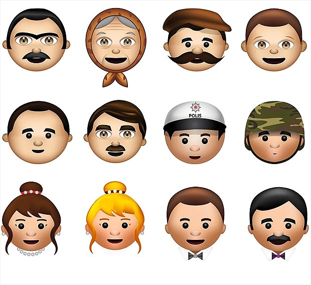 "Sultanahmet Camisi, baba, anne, gelin, damat, sünnetli çocuk, polis, asker, cezve, kazma, arkasından su dökmek, darbuka, çay, bıyıklı, gülen ve şaşırmış adam, vapur, simit, sucuklu yumurta ve gol ikonu."