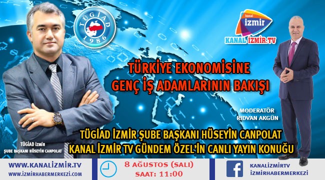 Türkiye'de müteşebbüs güçlerin dernekleşerek güç birliği oluşturup küresel anlamda dünyayla yarış edebilecek seviyeye gelmesinin temelinde genç iş adamları derneklerinin başarılı çalışmaları anlam taşır. Onlardan biri de 1986'da kurulan Türkiye Genç İş Adamları Derneğidir. TÜGİAD'ın kısa bir süre İzmir'de faaliyete geçirmiş olduğu ve tüm İzmirli genç iş adamlarını bir araya toplayan TÜGİAD İzmir Şubesi'nin başarılı başkanı İzmirli iş adamı Hüseyin Canpolat, Kanal İzmir televizyonunda Rıdvan Akgün'ün hazırlayıp sunduğu Gündem Özel programının canlı yayın konuğu olacaktır.