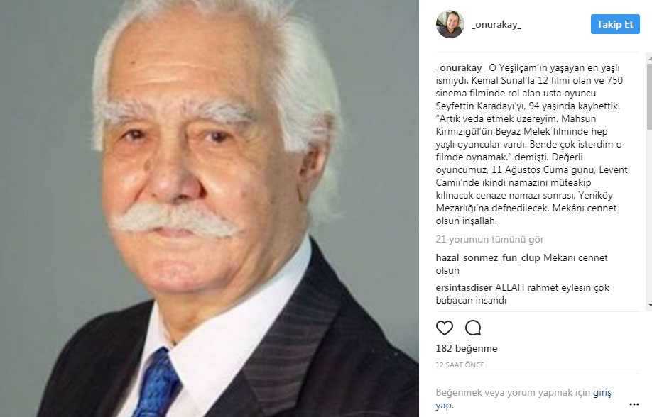 Ünlülerin ölüm haberleirni sosyal medya hesabından paylaşmasıyla tanınan oyuncu Onur Akay Yeşilçam oyuncusu Seyfettin Karadayı'nın vefat haberini sosyal medya hesabından paylaştığı fotoğraf ile duyurdu. Altına ise şu sözleri yazdı: